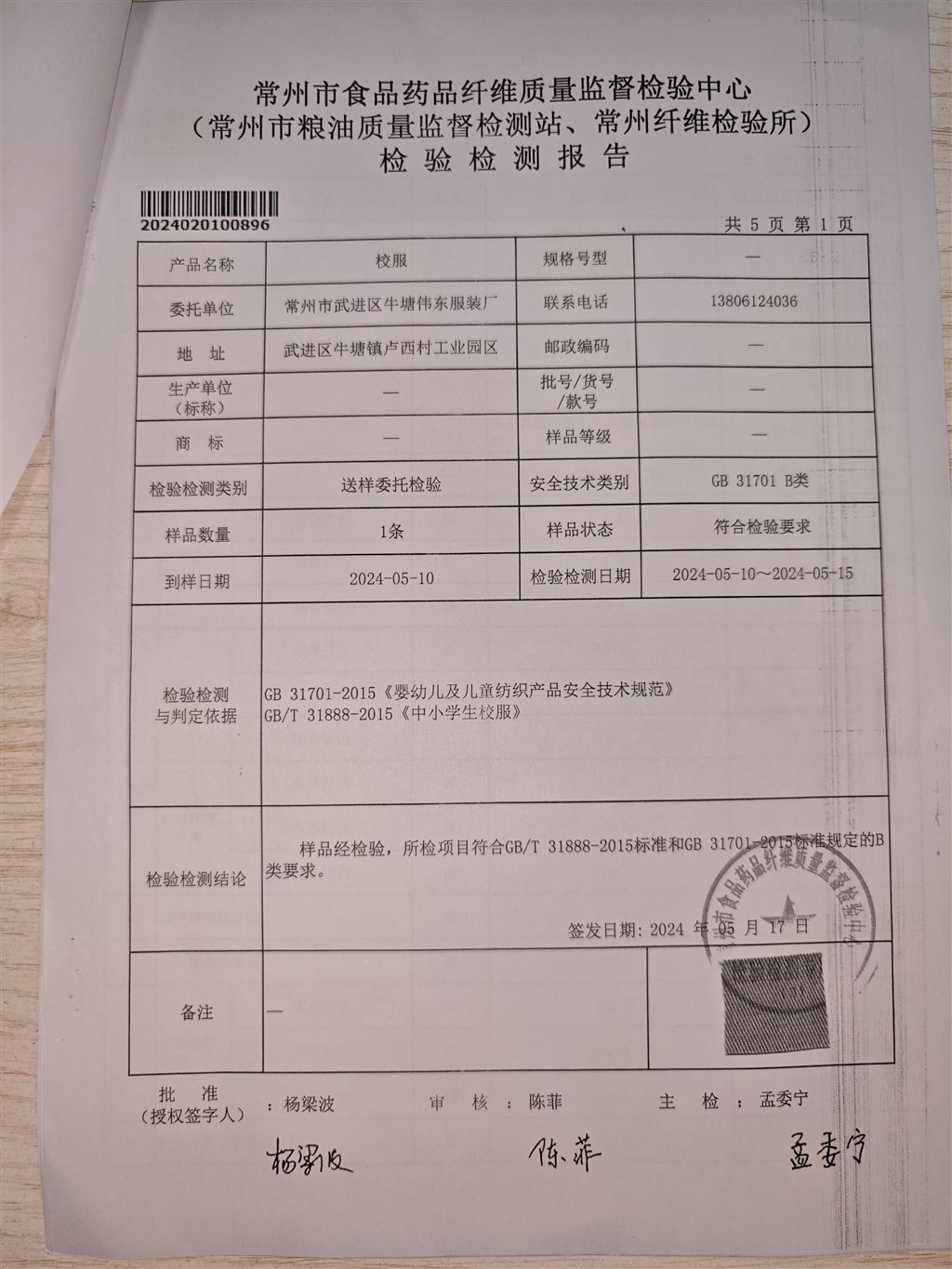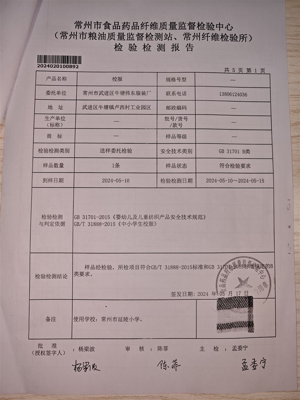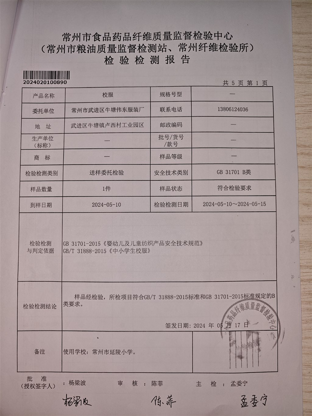 2024夏款校服供应商检测报告公示